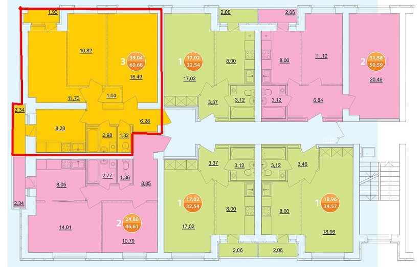 3-комн. квартира. площадь 60,68/39,04/8,28 кв.м.,